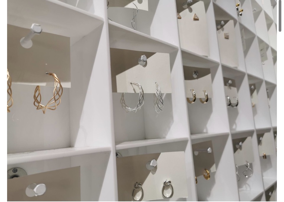 イヤリングやピアスは、棚にずらりと1つ1つのボックスに入って飾られています。