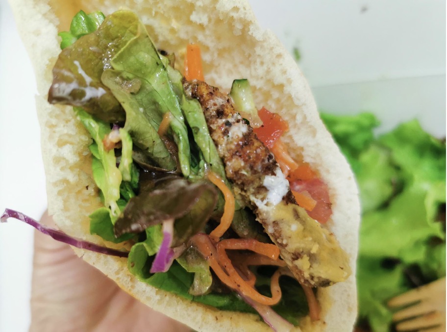 プレート野菜をふわっとしたパンの中に、シャキシャキ野菜とスパイスの効いたファラフェルをぎっしり詰めて、食べる。