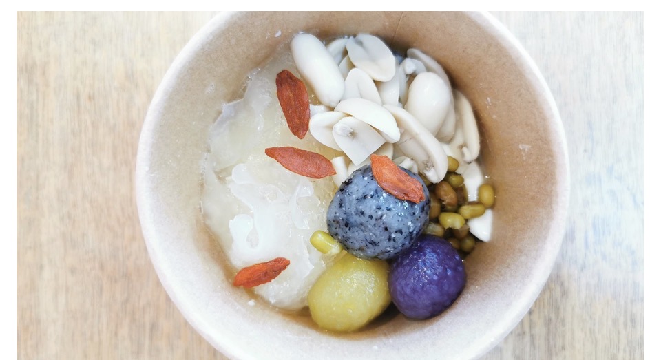 豆花のトッピングは、甘く煮た豆や、サツマイモ団子、白きくらげ、ピーナッツを煮たもの、はと麦などなど、日替わりで3~4種類トッピングがついて、サイズやトッピングでお値段が変わります。