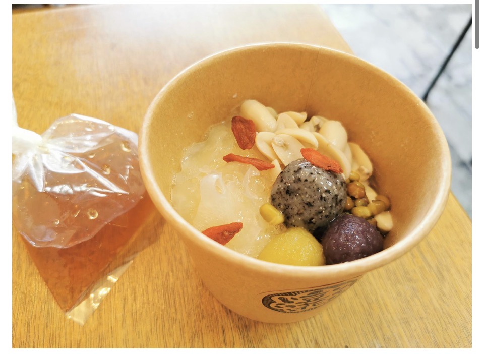 中には杏仁豆腐のような白さの豆花に、トッピングされたお団子がモチモチとして、ピーナツ煮が口の中で相まって美味しかった!