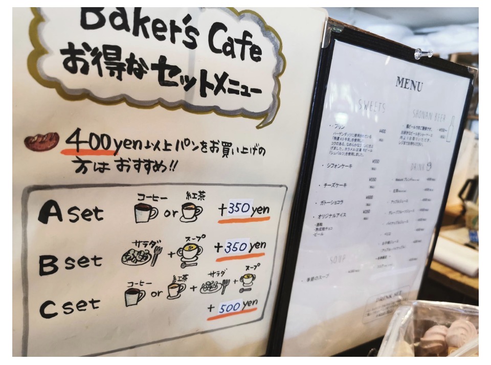 ベーカリでは、テイクアウトだけではなく、ベーカリーも食べられるスペースもあり、お得なセットも用意されています。