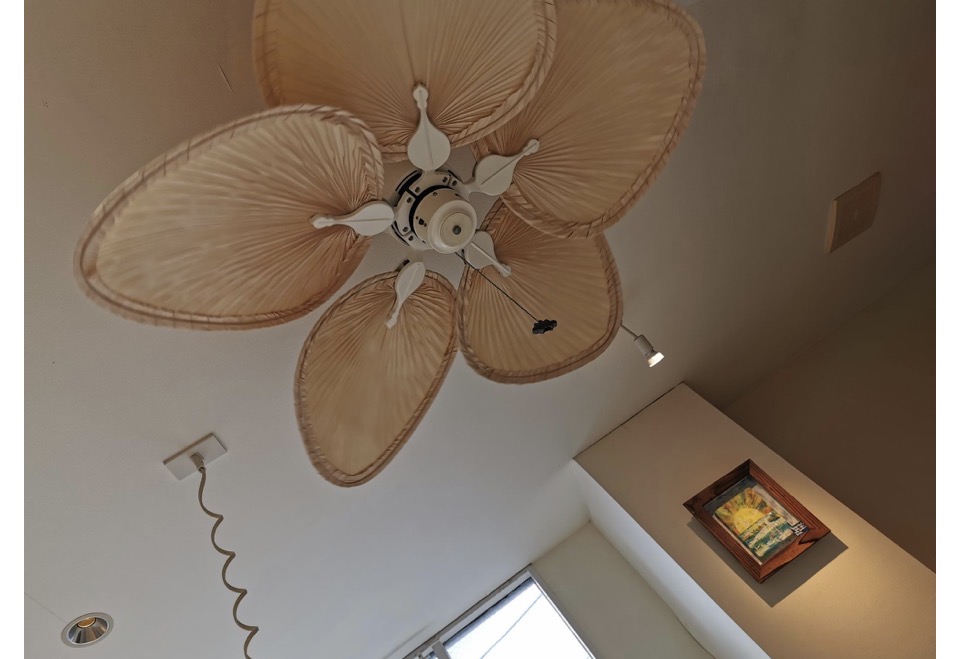 天井にあるヤシの葉でつくられたシーリングファンは、室内の温度をちょうどよく調整してくれて見た目もオシャレ。