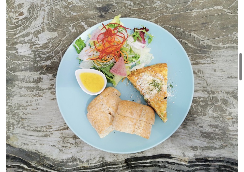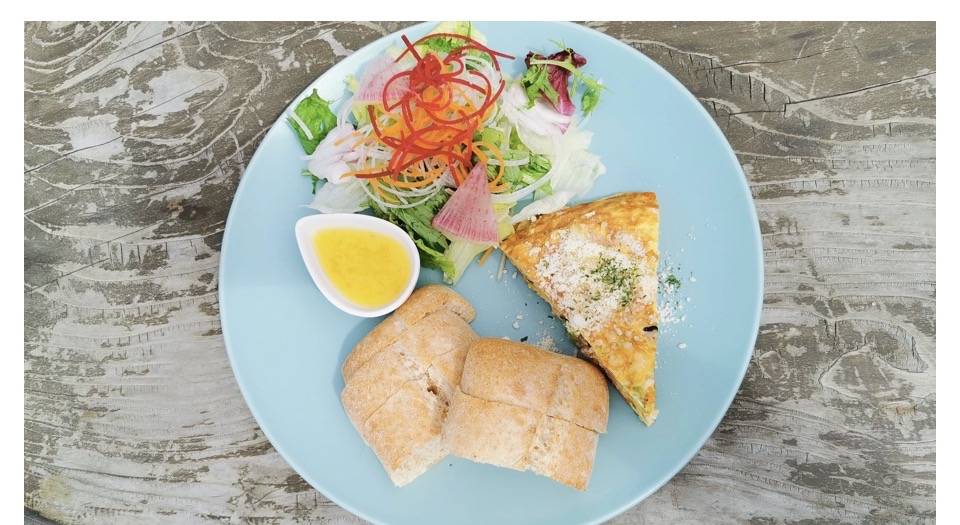 ワンプレートランチの【 柿右衛門農園の野菜入り 】スペイン風具だくさんのオムレツ、全粒粉パン添え、ドリンク付きです。