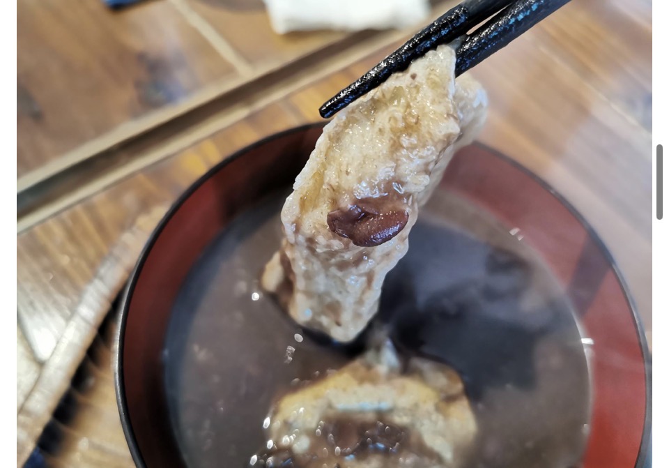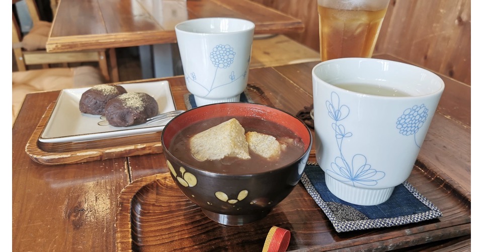 お汁粉は甘さ控えめで、自家製玄米餅が入り、ツブツブした食感が美味しい!