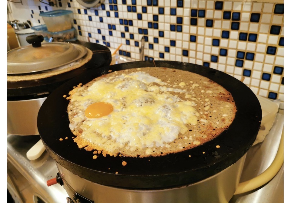 手際よく、クレープのように生地を伸ばし、具材をのせていきます。