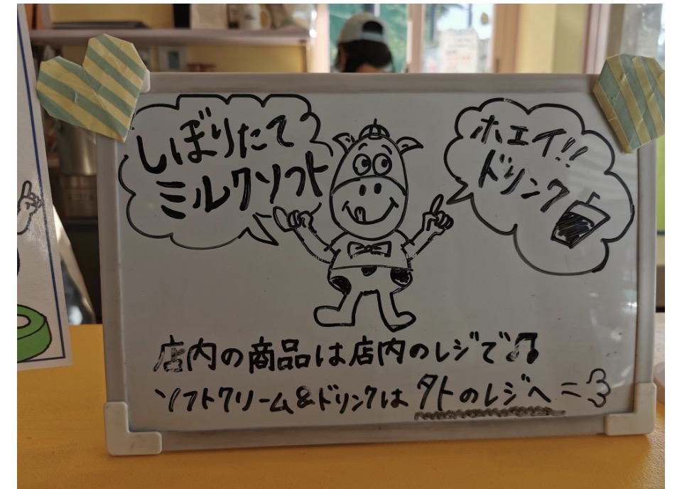 店内商品は店内で清算ですが、しぼりたてのミルクソフトと、ホエイドリンクは外のレジから購入します。