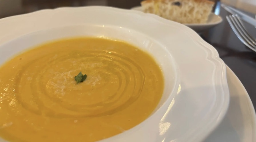深みのあるスープです。添えられたフォカッチャはふわふわで、スープとよく合います。