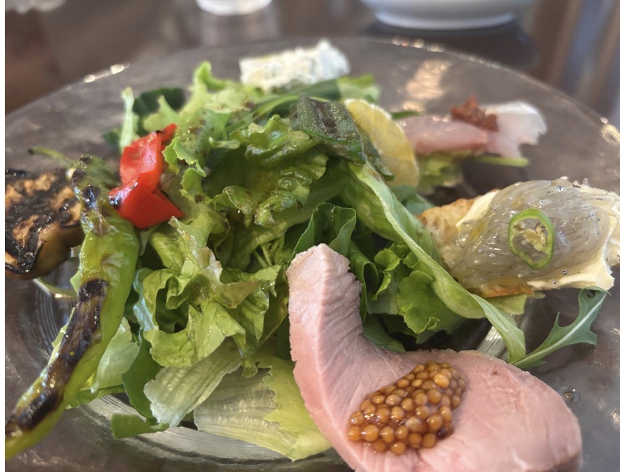 運ばれてきたのは、大きめの透明なガラス皿に美しく盛り付けられた前菜たち。