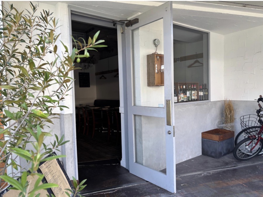 白い壁に木の扉、そしてガラス越しに覗くワインボトルやカウンターの奥のキッチン。