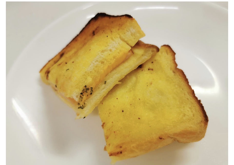 自宅でハムチーズフレンチトーストをトーストして食べましたが、中のチーズがとけて、フレンチトーストの甘さとハムのしょっぱさがちょうどいい!