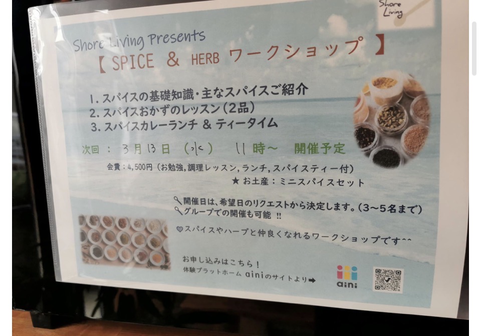 ヒトヤスミカフェShore Livingさんでは、ワークショップも盛んで、スパイスカレーについて本格的に学べるワークもあり、レッスンをしてランチも食べられるなんて、なんてお得なの!