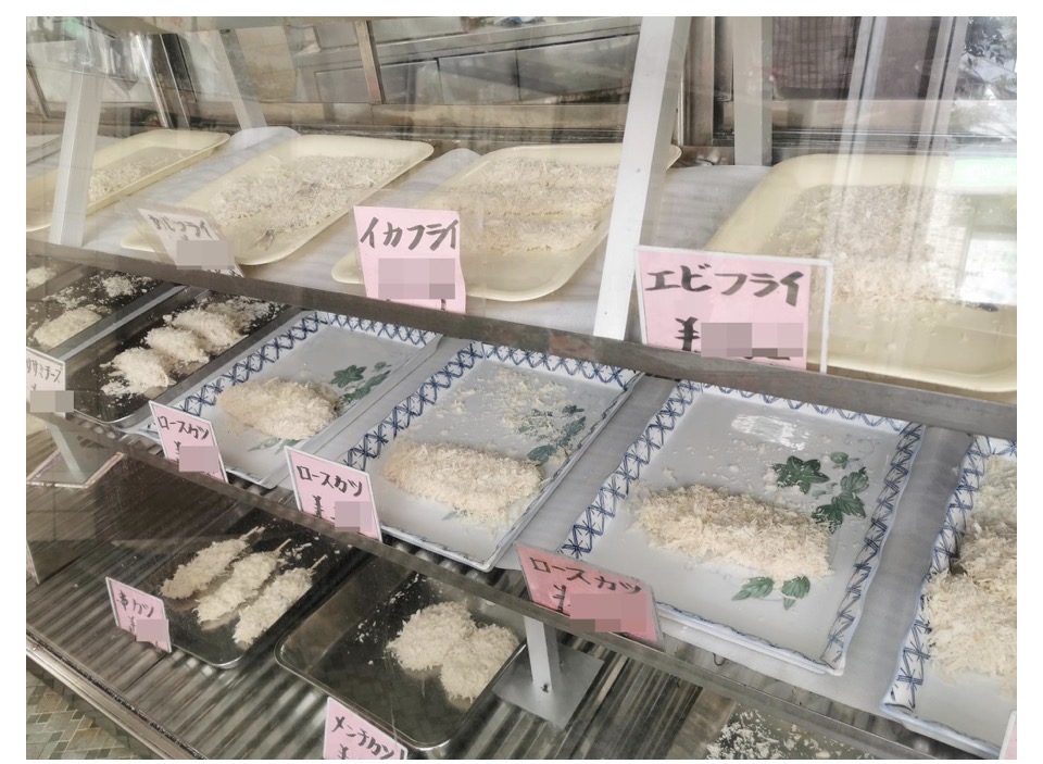 見た目はお肉やさんのように見えますが、ガラスケースにはこれから揚げるコロッケや、エビフライなどが並びます。