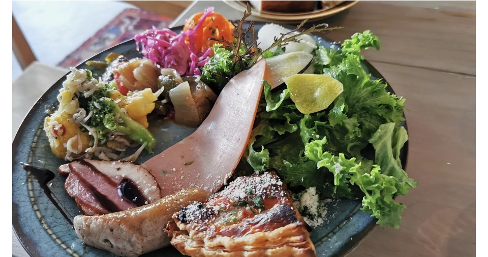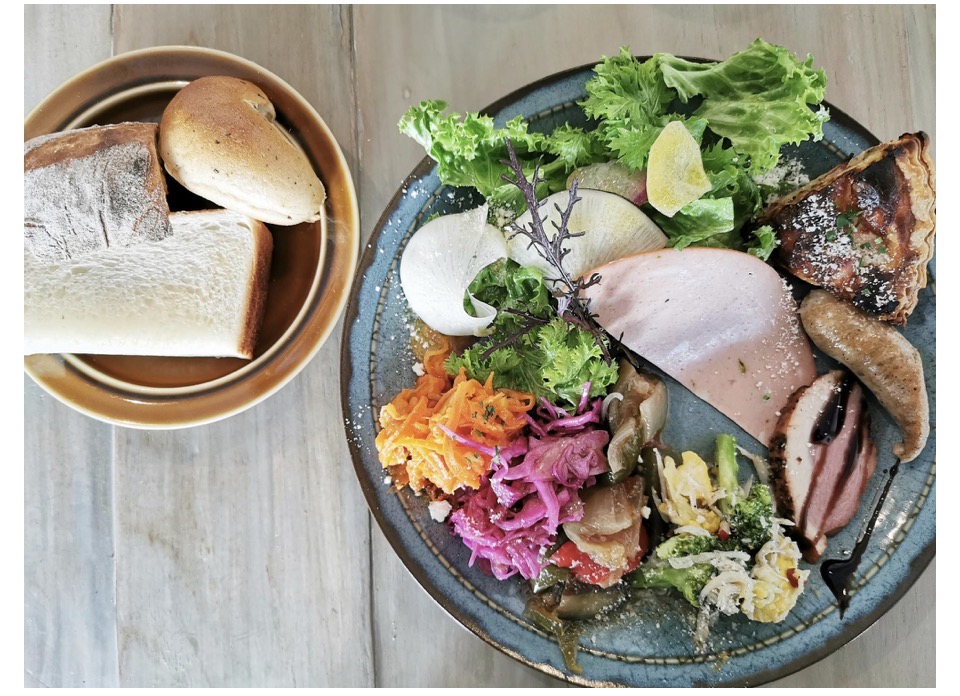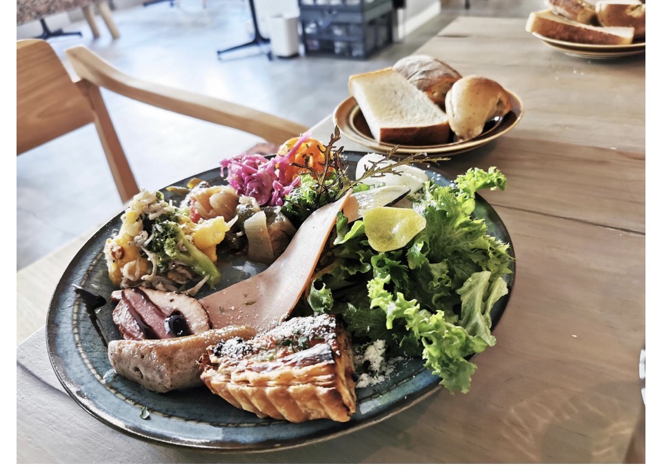 ワンプレートにサラダ、イタリアンソーセージのサルシッチャとイタリアの伝統ハムモルタデッラ、キッシュや総菜がずらりと並び、別のお皿にパン3種類と、色どりも美しく食欲をそそります。