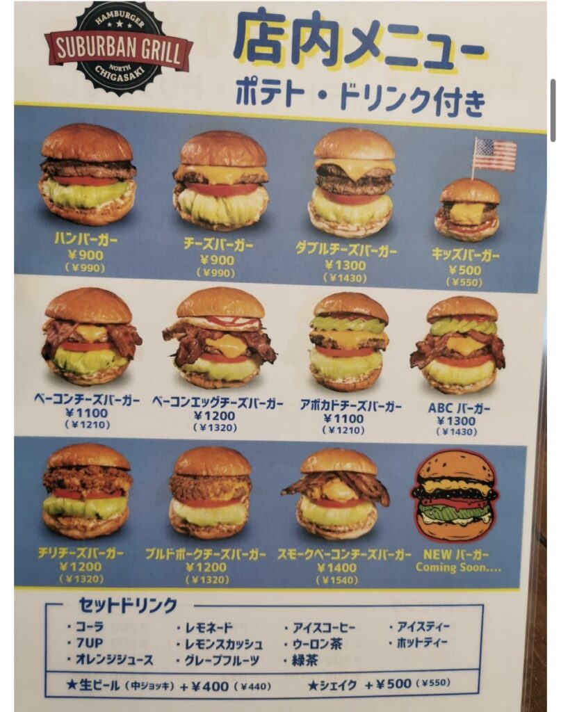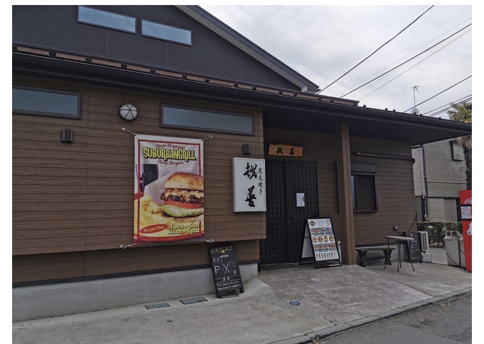 SUBURBAN GRILLは居酒屋の使用していない昼間の時間を借りて、営業しているため、初めての方だとここで合っているの?と分かりにくいですが、大きなハンバガーの写真で分かりますよ。