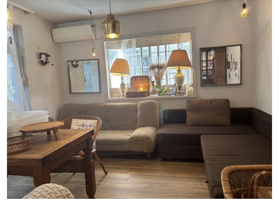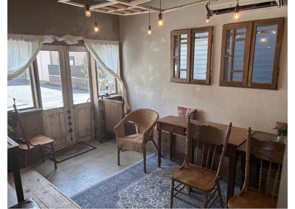 店内は木の家具を中心にしたナチュラルなインテリアでまとめられていて、アンティークな椅子やランプ、レースのカーテン、籐の椅子など、どこを切り取っても絵になる空間。