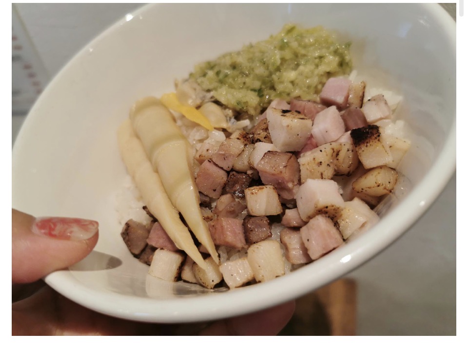 チャーシューと姫竹、貝、生姜ののったどんぶりは、しっかりと味のあるチャーシューの油を生姜とあわせる事でさっぱりと食べられ、ぜいたくなどんぶりですね。