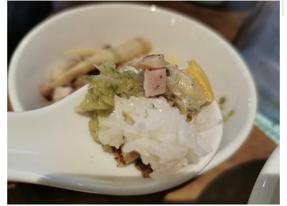 ラーメンの上にトッピングがされているのはホンビノス貝、小松菜、姫竹、お肉でどれも魚介ラーメンにピッタリな歯ごたえとお味。