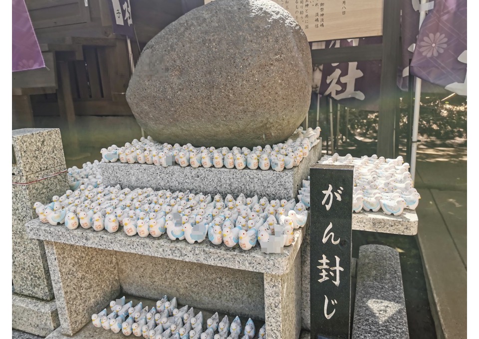 淡嶋神社の横には、体の悪い場所をなでるとよくなると伝えられている石があり、鶴嶺八幡宮の神様のお使いの鳩に願いが書かれています。