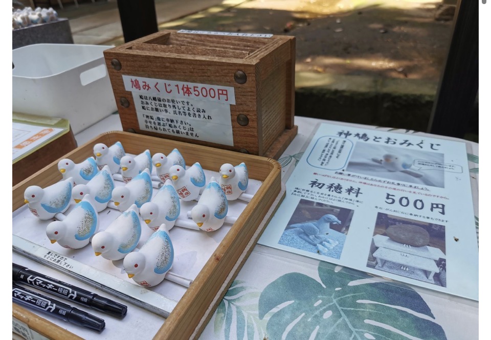 この鳩は、鳩みくじについてあり、おみくじを取り外し、鳩にお願い事とお名前を書いて神鳩として奉納できます。